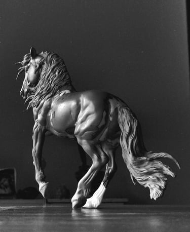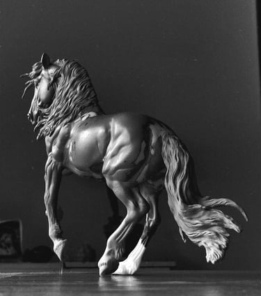 My horses aren't mere models, they're one of a kind, unique pieces of art, which I pour my heart and soul into. I want them to be treated as such; handled with care and be loved. I intend them to be appreciated in a cabinet, especially as I make rather delicate work.